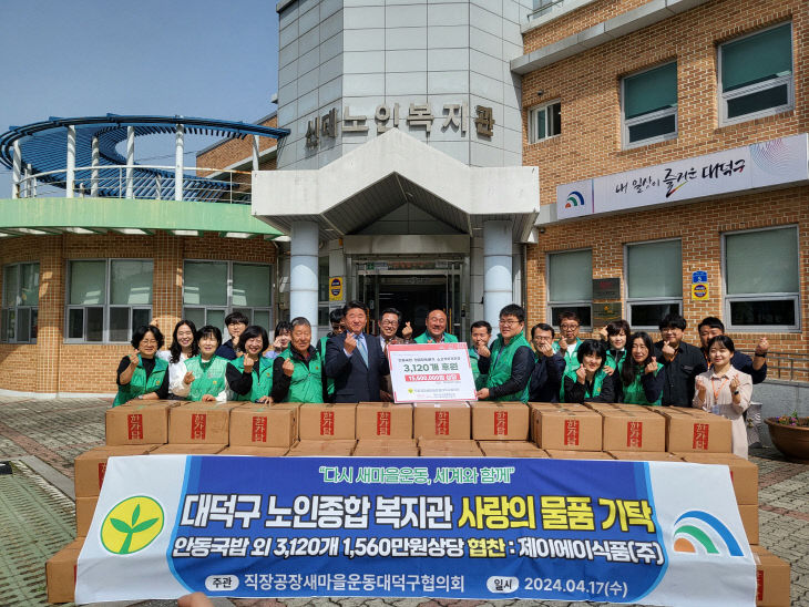 이날 제이에이식품(주)에서 협찬하고 직장공장새마을운동대덕구협의회에서 대덕구 어르신들에게 후원하기 위해 국밥 밀키트(안동국밥 등 2종류) 3120개(1560만 원 상당)를 대덕구노인종합복지관을 이용하는 어르신들과 홀로 거주하는 독거 어르신들 약 1500명에게 전달했다.